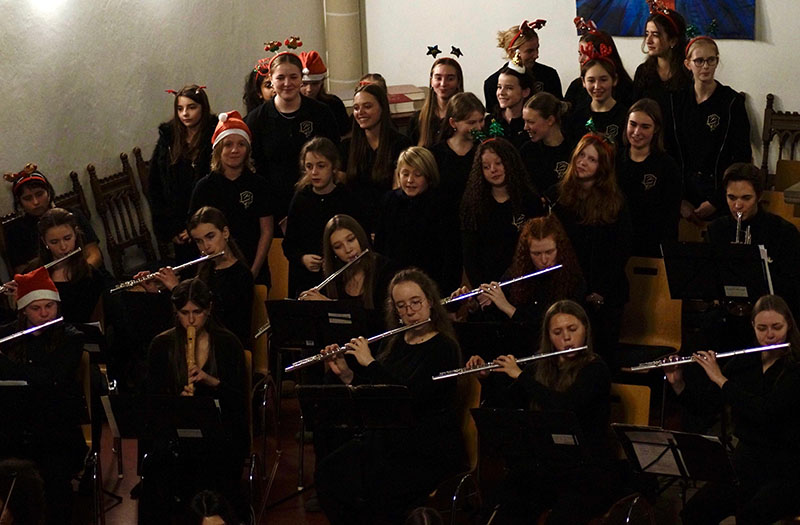 Eröffnet wurde das Konzert mit Johann Sebastian Bachs Choral „Ich steh an deiner Krippen hier“ aus dem Weihnachtsoratorium, gefolgt von weiteren traditionellen Weihnachtsstücken wie „Adeste fideles“ und „We wish you a Merry Christmas“. Der Belcanto-Chor zeigte sein Können unter anderem mit „Lasst uns froh und munter sein“ und „Engel singen Jubellieder“. Einer der musikalischen Höhepunkte war zweifellos die Auswahl aus Tschaikowskys „Nussknacker“-Ballett, darunter der berühmte Tanz der Zuckerfee und der Blumenwalzer. Moderne Klassiker wie „Rudolph, the Red-Nosed Reindeer“, „White Christmas“, „Jingle Bells“ und „Jingle Bell Rock“ sorgten für fröhliche Adventsstimmung. Zum Abschluss erklangen u. a. „Alle Jahre wieder“ sowie eine von Günther Westenberger eigens arrangierte Choralbearbeitung über Bachs Weihnachtsoratorium.