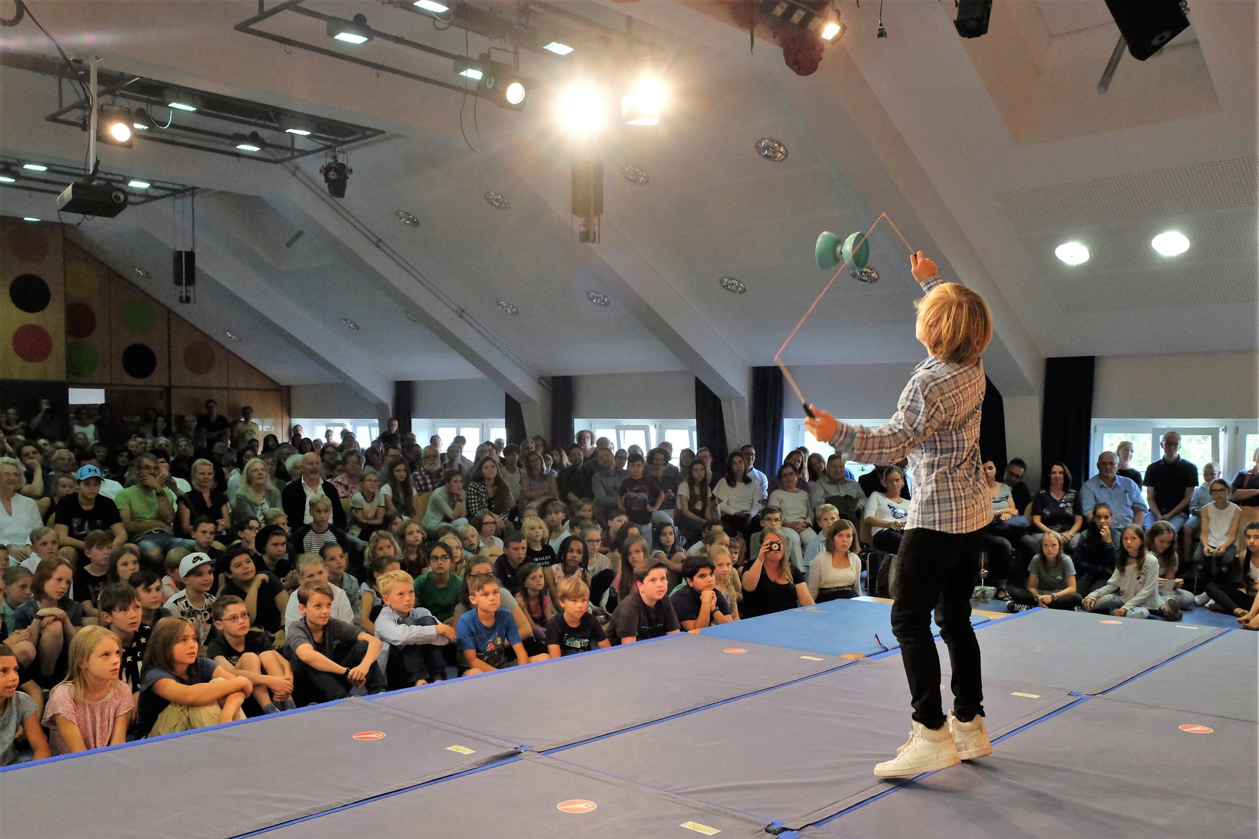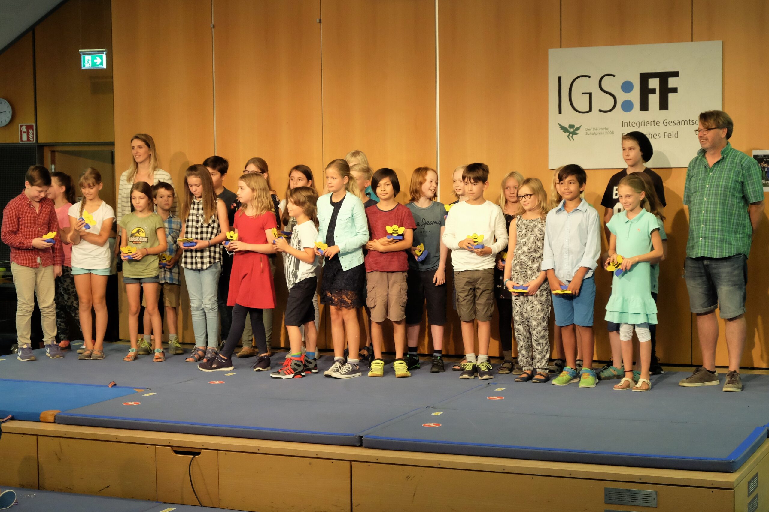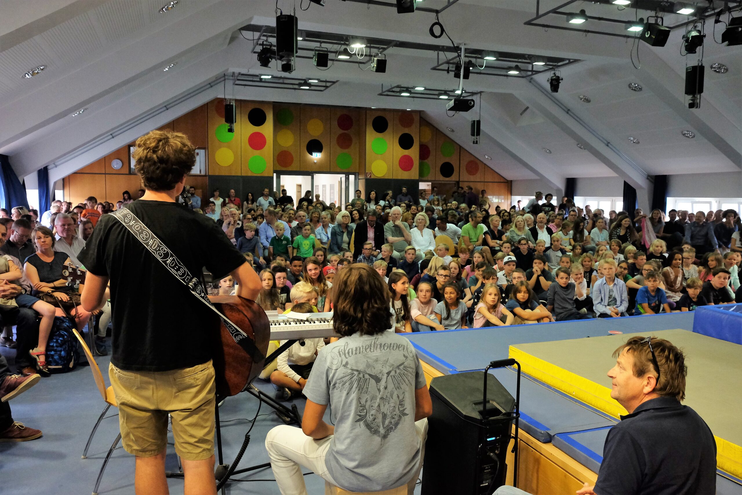 Am 4. August um 14.00 Uhr war es soweit: Die Schülerinnen und Schüler des neuen fünften Jahrgangs wurden als neue Schulmitglieder willkommen geheißen. Traditionell bereitete der ehemalige fünfte Jahrgang unter Leitung der derzeitigen Jahrgangsleiterin Jessica Fiebig die Einschulungsfeier vor und sorgte für ein unterhaltsames und kurzweiliges Programm. Schülerinnen des nun 6. Jahrgangs moderierten am Nachmittag die verschiedenen Punkte: eine Tanzeinlage, sportlich-akrobatische Sprünge, die Begrüßung durch den Schulleiter, Andreas Meisner, der diesmal als Koch mit einem Kochbuch auftrat, menschliche Pyramiden und eine faszinierende Vorführung, was man alles mit einem Diabolo machen kann – alles aus dem Jahrgang. Nur die nahezu professionelle musikalische Einleitung kam von zwei Schülern des 8. Jahrgangs. Danach begrüßte die Jahrgangsleiterin des neuen fünften Jahrgangs, Frau Nina Blasche, die Neuankömmlinge und dann ging es endlich zum ersten Mal in die neuen Klassen. Die Wartezeit bis zur Rückkehr der Kinder konnten die Gäste bei Kaffee und Kuchen und guten Gesprächen verkürzen. Für das leibliche Wohl hatten Eltern des ehemaligen fünften Jahrgangs ein vielfältiges Kuchenbuffet bereitet. Für den runden Abschluss der Veranstaltung sorgten die Neuankömmlinge selbst: Sie hatten für Ihre Eltern ein kleines Lied eingeübt, das sie ihren Eltern dann zum Abschluss der Veranstaltung in den neuen Schul-T-Shirts präsentierten, die der Förderverein als Begrüßungsgeschenk gespendet hat.