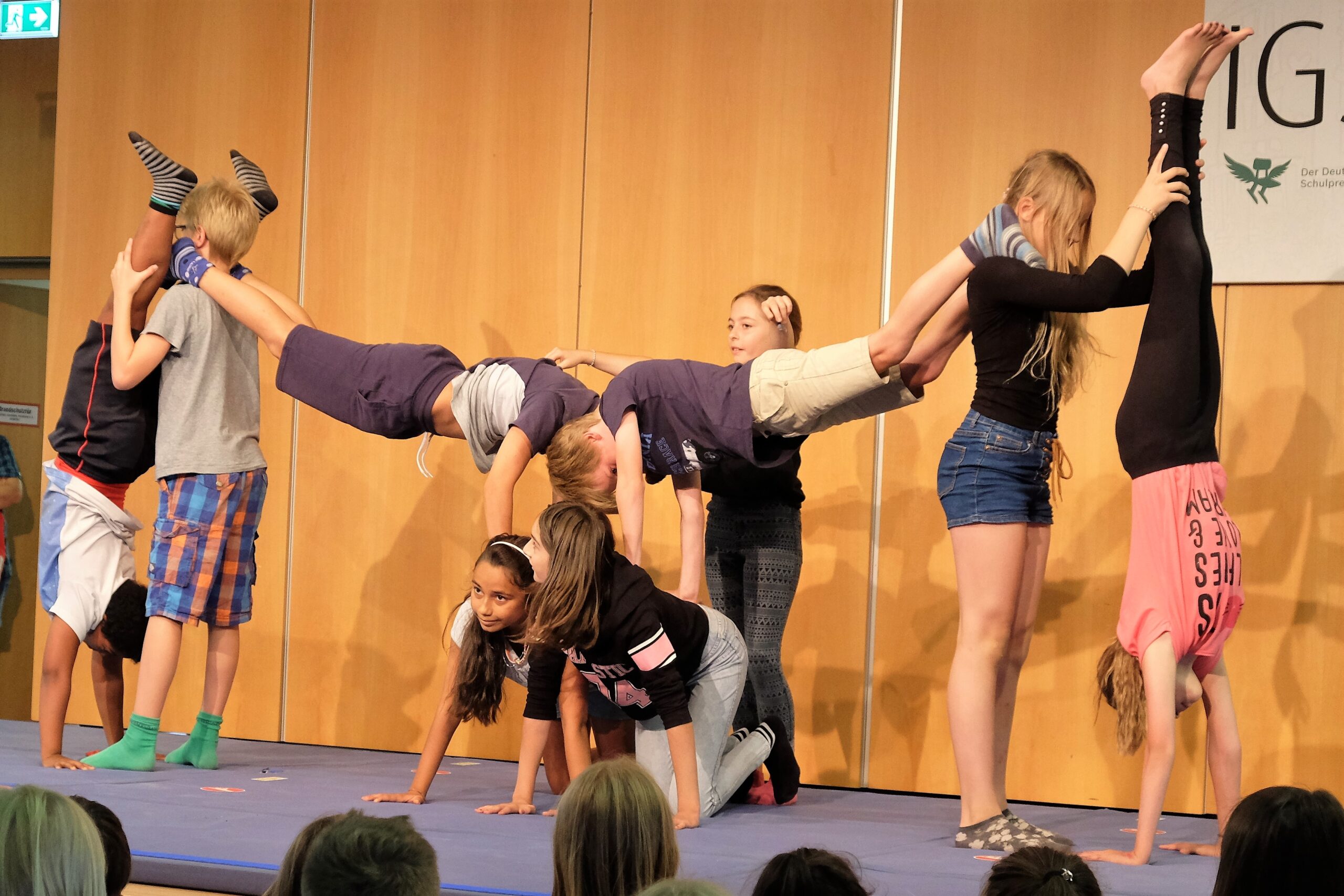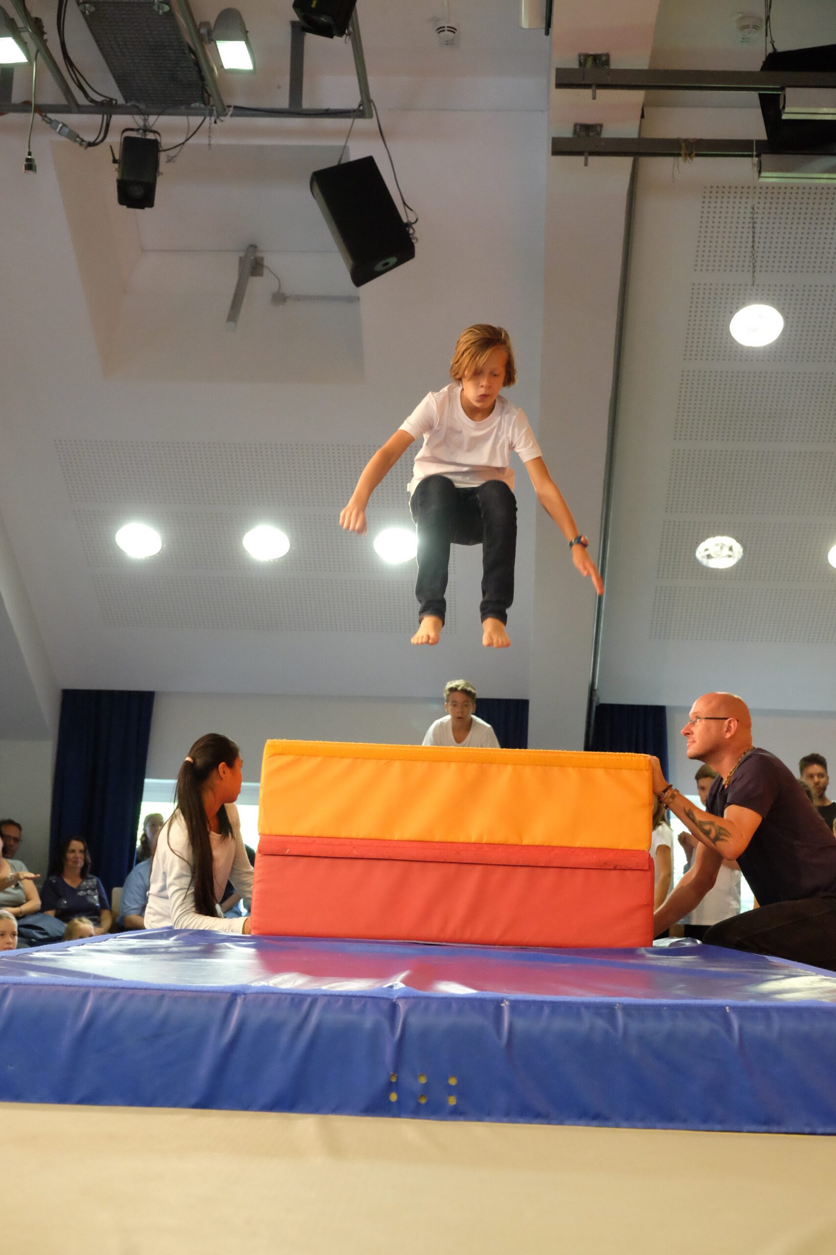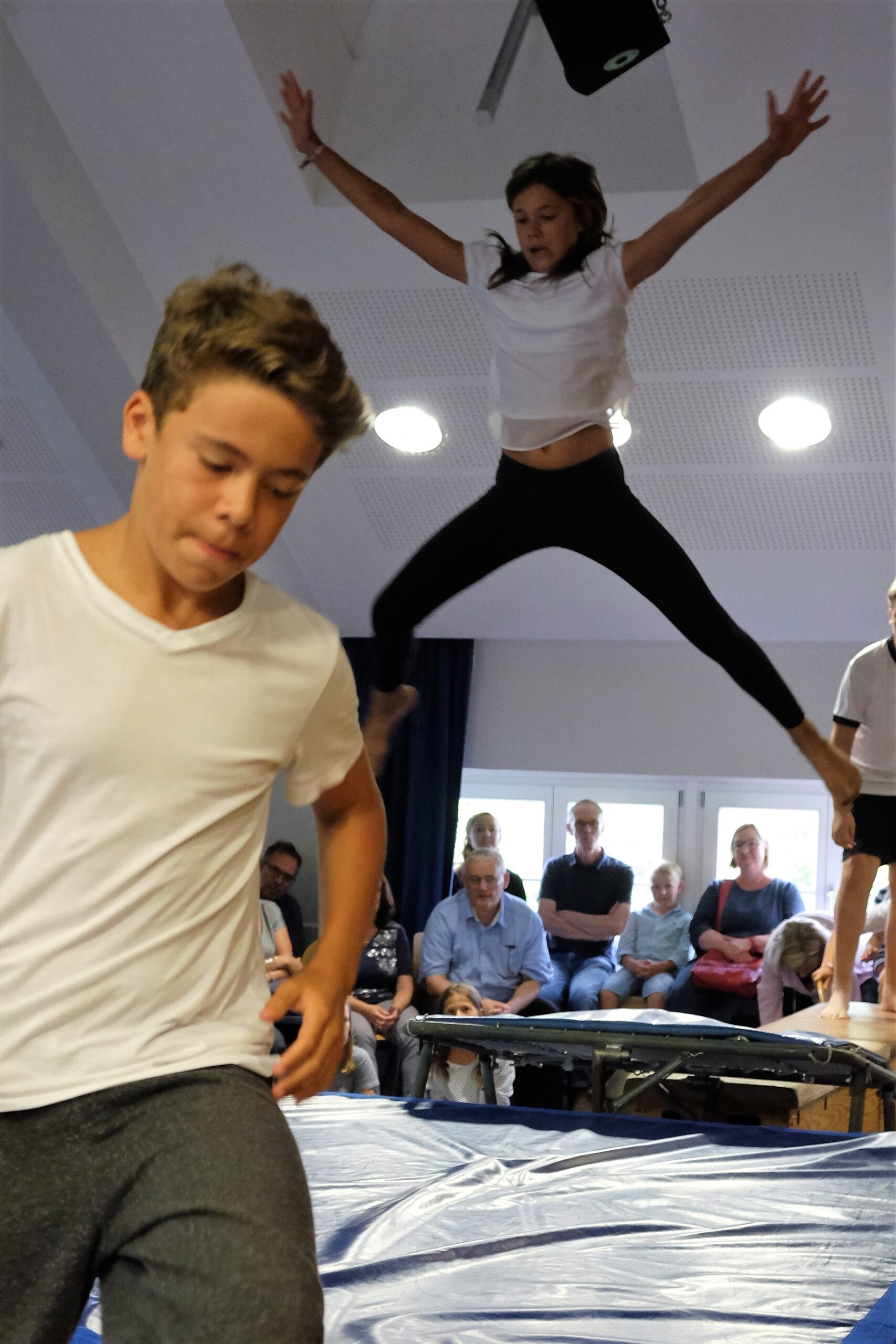 Am 4. August um 14.00 Uhr war es soweit: Die Schülerinnen und Schüler des neuen fünften Jahrgangs wurden als neue Schulmitglieder willkommen geheißen. Traditionell bereitete der ehemalige fünfte Jahrgang unter Leitung der derzeitigen Jahrgangsleiterin Jessica Fiebig die Einschulungsfeier vor und sorgte für ein unterhaltsames und kurzweiliges Programm. Schülerinnen des nun 6. Jahrgangs moderierten am Nachmittag die verschiedenen Punkte: eine Tanzeinlage, sportlich-akrobatische Sprünge, die Begrüßung durch den Schulleiter, Andreas Meisner, der diesmal als Koch mit einem Kochbuch auftrat, menschliche Pyramiden und eine faszinierende Vorführung, was man alles mit einem Diabolo machen kann – alles aus dem Jahrgang. Nur die nahezu professionelle musikalische Einleitung kam von zwei Schülern des 8. Jahrgangs. Danach begrüßte die Jahrgangsleiterin des neuen fünften Jahrgangs, Frau Nina Blasche, die Neuankömmlinge und dann ging es endlich zum ersten Mal in die neuen Klassen. Die Wartezeit bis zur Rückkehr der Kinder konnten die Gäste bei Kaffee und Kuchen und guten Gesprächen verkürzen. Für das leibliche Wohl hatten Eltern des ehemaligen fünften Jahrgangs ein vielfältiges Kuchenbuffet bereitet. Für den runden Abschluss der Veranstaltung sorgten die Neuankömmlinge selbst: Sie hatten für Ihre Eltern ein kleines Lied eingeübt, das sie ihren Eltern dann zum Abschluss der Veranstaltung in den neuen Schul-T-Shirts präsentierten, die der Förderverein als Begrüßungsgeschenk gespendet hat.