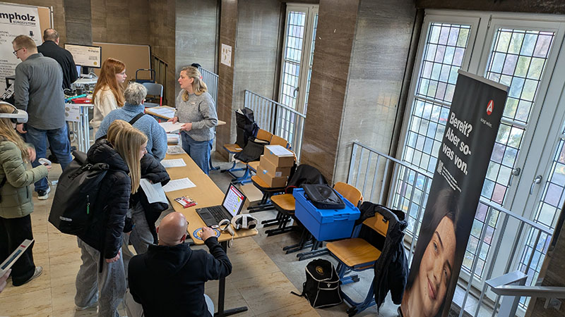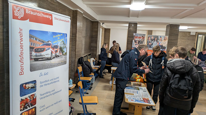 Schon beim Betreten der Schule war klar: Hier geht es nicht nur um Flyer und Kugelschreiber. Mitmachstationen luden dazu ein, selbst aktiv zu werden. Bei Bühler konnten die Besucher:innen einen Blick in die Welt der Lebensmitteltechnologie werfen, während die Berufsfeuerwehr mit Erste-Hilfe-Rucksack und Einsatzkleidung für echtes Einsatz-Feeling sorgte. Wer sich für Sicherheit interessierte, war bei Protego genau richtig – dort gab es praktische Einblicke in Schutzsysteme und Sicherheitslösungen. Auch das städtische Klinikum (SKBS) bot tiefe Einblicke in die dortigen Ausbildungsberufe.