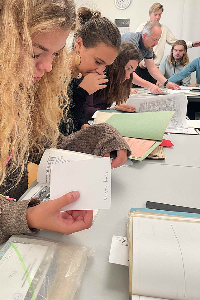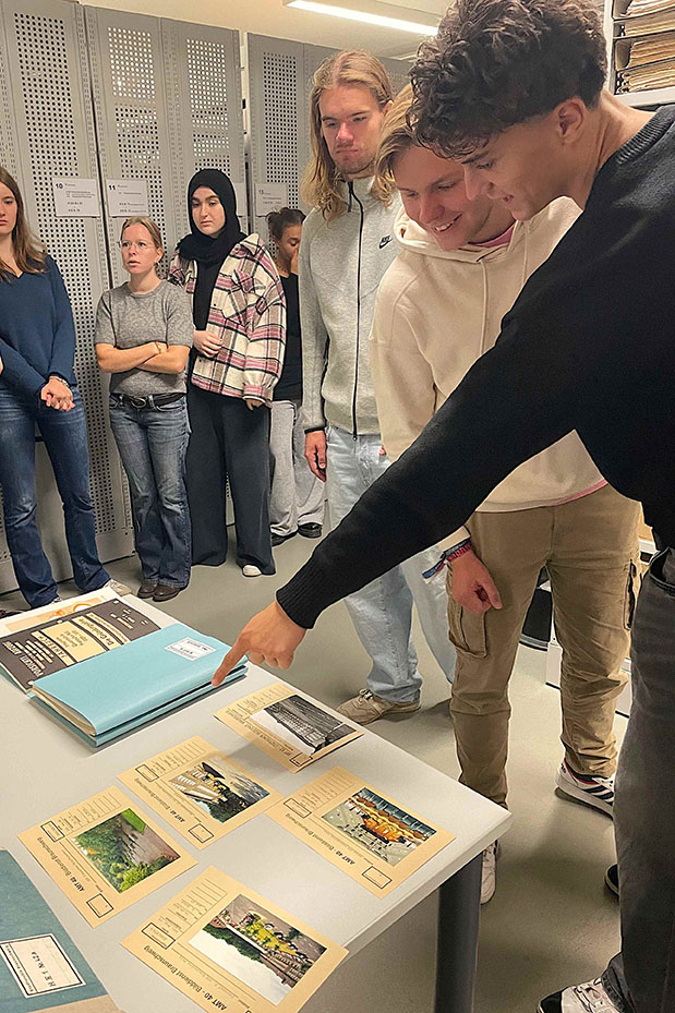 Nach ersten Recherchen besuchte der Kurs das Stadtarchiv, wo die Schüler:innen vom Archivar Mark Oppalka herzlich empfangen und fachkundig durch die Bestände geführt wurden. Unterstützt von einem Praktikanten hatte das Archivteam bereits eine thematische Vorauswahl passender Materialien zusammengestellt. So konnten die Schüler:innen direkt mit der Auswertung originaler Quellen beginnen – eine besonders eindrucksvolle und praxisnahe Erfahrung.