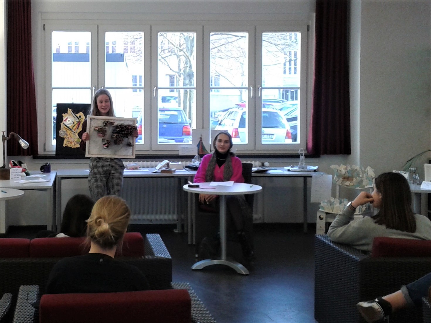 Sie stellten ihre Objekte und ihre damit einhergehenden Gedanken und Intentionen dem Publikum zusätzlich durch ein kleines Rollenspiel vor. Im Rahmen einer simulierten Auktion ersteigerten sie ihre Kunstwerke und erläuterten, in einer Argumentation mit der Auktionatorin, ihre Ideen.