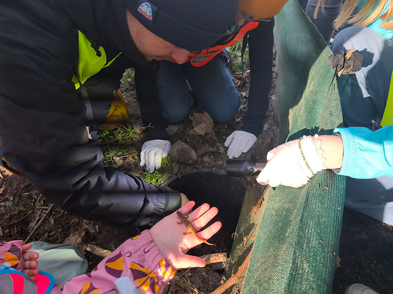 Nach einem Gruppenfoto ging es endlich los. In zwei Gruppen liefen wir verschiedene Schutzzäune ab, wo in bestimmten Abständen Eimer angebracht waren, in die die Kröten und Molche auf ihrem Weg zum Tümpel hineinfielen. Nun holten wir sie heraus und protokollierten, welche Art wir gefunden hatten. Alle waren ziemlich aufgeregt. Manche sagten zunächst, die Tiere seien eklig, aber die meisten von uns fanden sie niedlich. Die eine Gruppe der 5.1 gab sogar allen Tieren einen eigenen Namen! Ganz zum Schluss fand unsere Lehrerin in einem Eimer noch einen Teichmolch, den wir übersehen hatten. Weil das kleine Tierchen so niedlich und auch ein Weibchen war, nannten wir es nach unserer Lehrerin „Eva“.